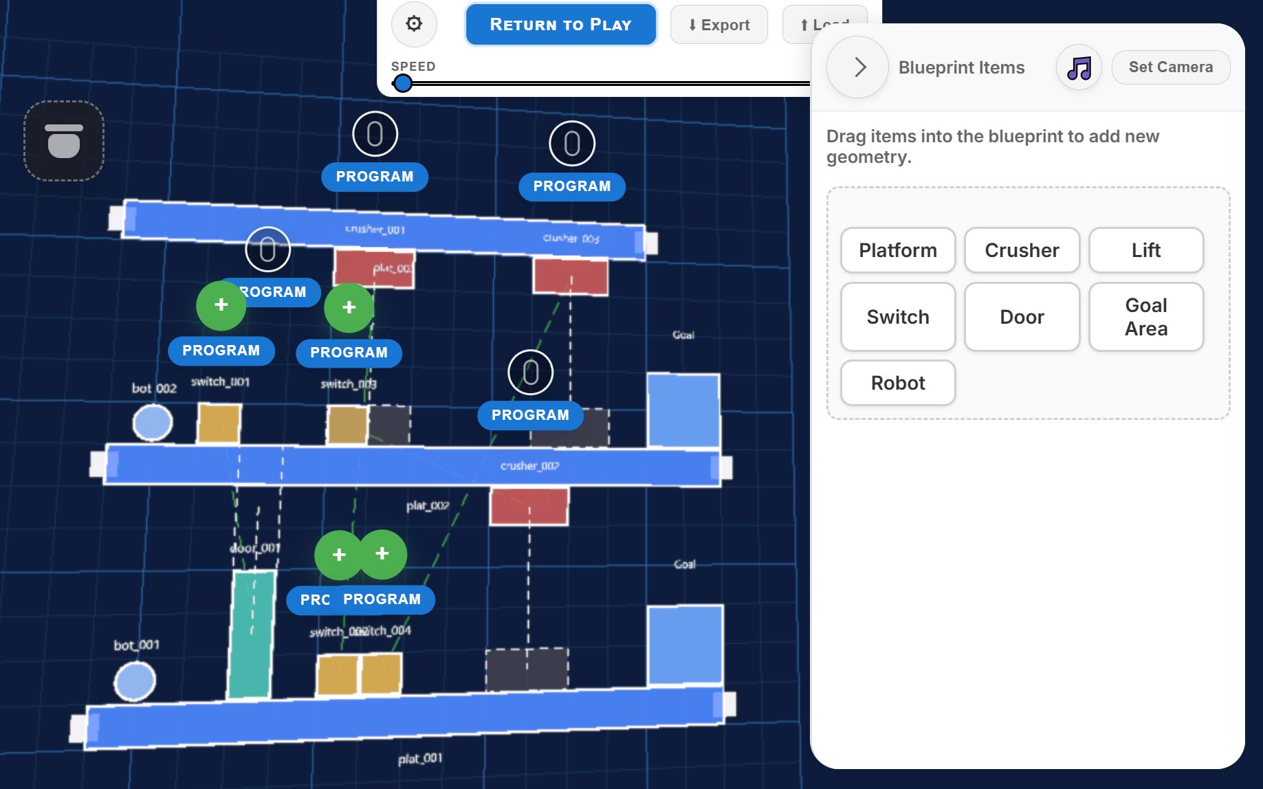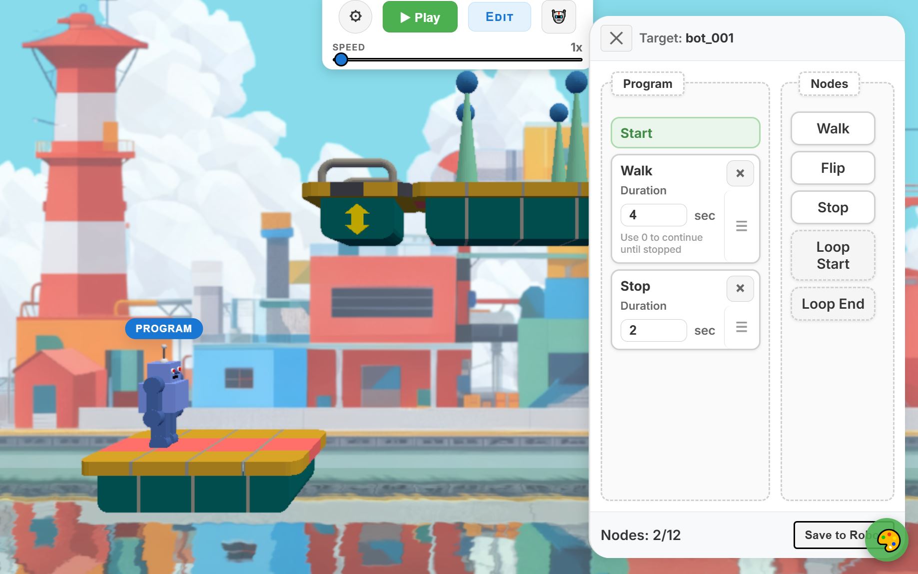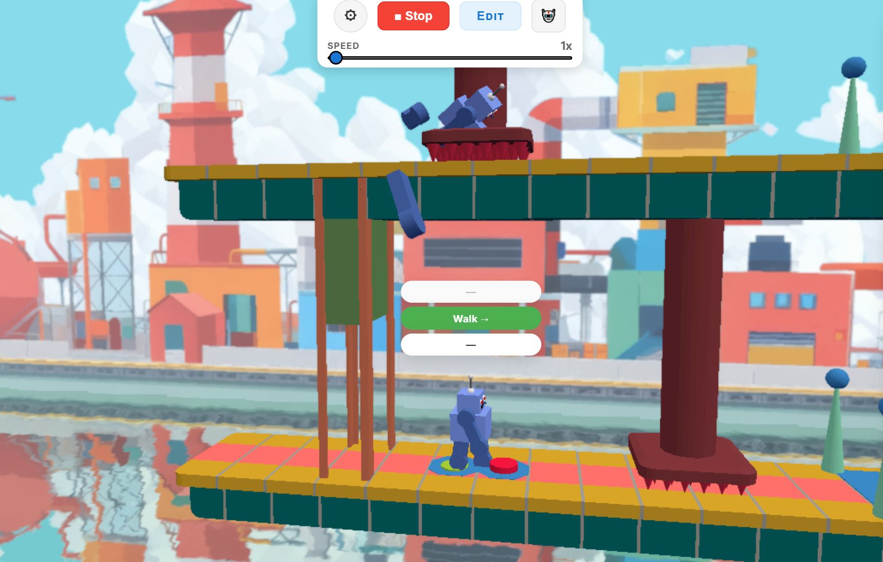 RoboRun is a retro-styled 2.5D puzzle-platformer where you program your robot instead of controlling it directly. Plan short command sequences - walk, wait, loop, turn - and watch your mechanical creation clank through a hazardous factory filled with crushers, elevators, and switches. Every movement is deterministic, so victory depends on logic, not reflexes. Customize your robot, tackle 9 handcrafted stages, and create your own puzzles in the built-in level editor